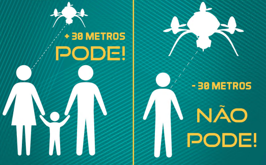 A ANAC regulamenta que os voos com drones que possuam mais 250g só poderão ocorrer áreas distantes de outras pessoas com, no mínimo, trinta metros horizontais. Além disso, a responsabilidade pelo voo é do piloto operador e deve seguir as regras de utilização do espaço aéreo instituídas pelo DECEA.